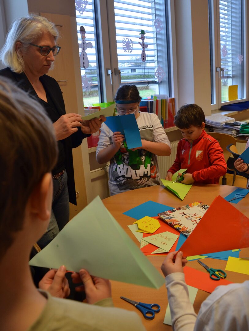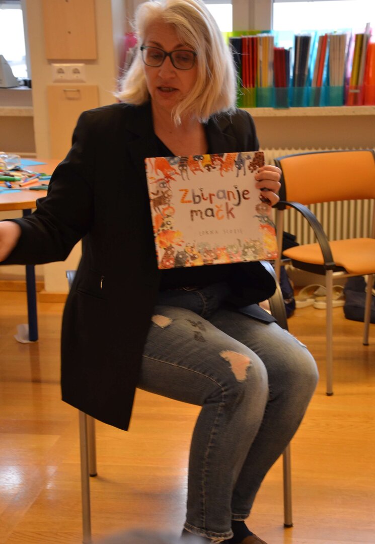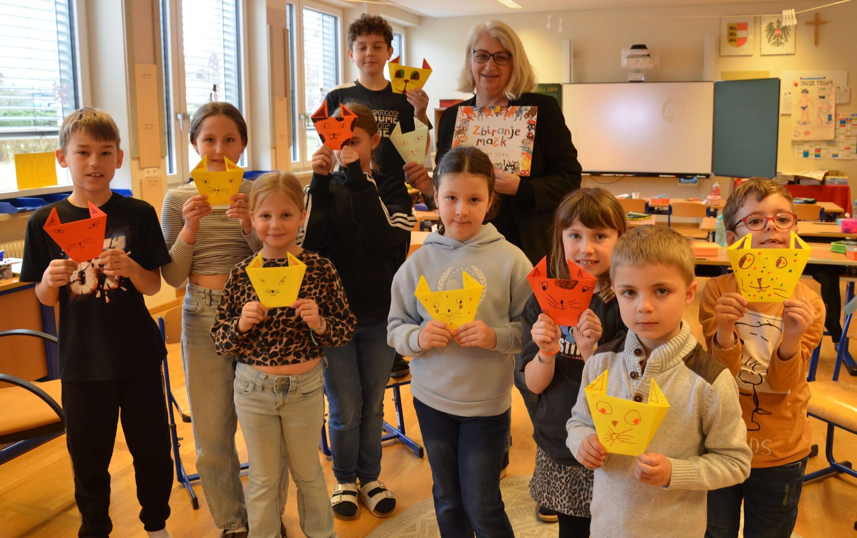 4. Vorlesestation: Von Frau Lehrerin Sonja Maurel hörten die Kinder das Buch “Zbiranje mack” in der slowenischen Sprache. Begeistert bastelten sie anschließend, gemeinsam mit der Frau Lehrerin, Katzengesichter.