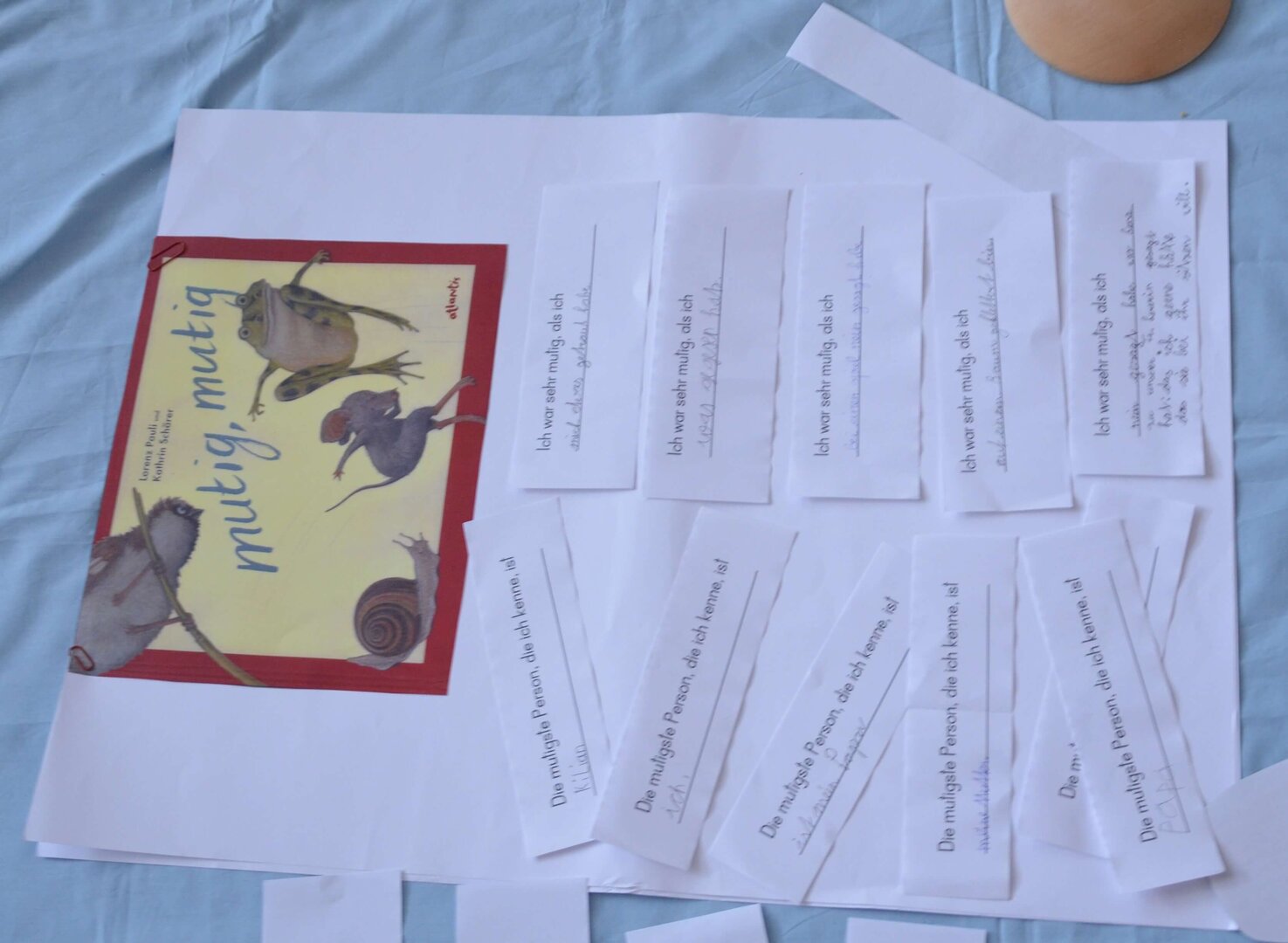 1. Vorlesestation: Frau Lehrerin Anna Rusch las das Buch “Mutig, mutig” vor. Anschließend wurden die Kinder dazu eingeladen, folgende Aufträge zu erledigen: Was bedeutet für dich Mut? Wer ist für dich die/der Mutigste? Warst du schon einmal so richtig mutig?