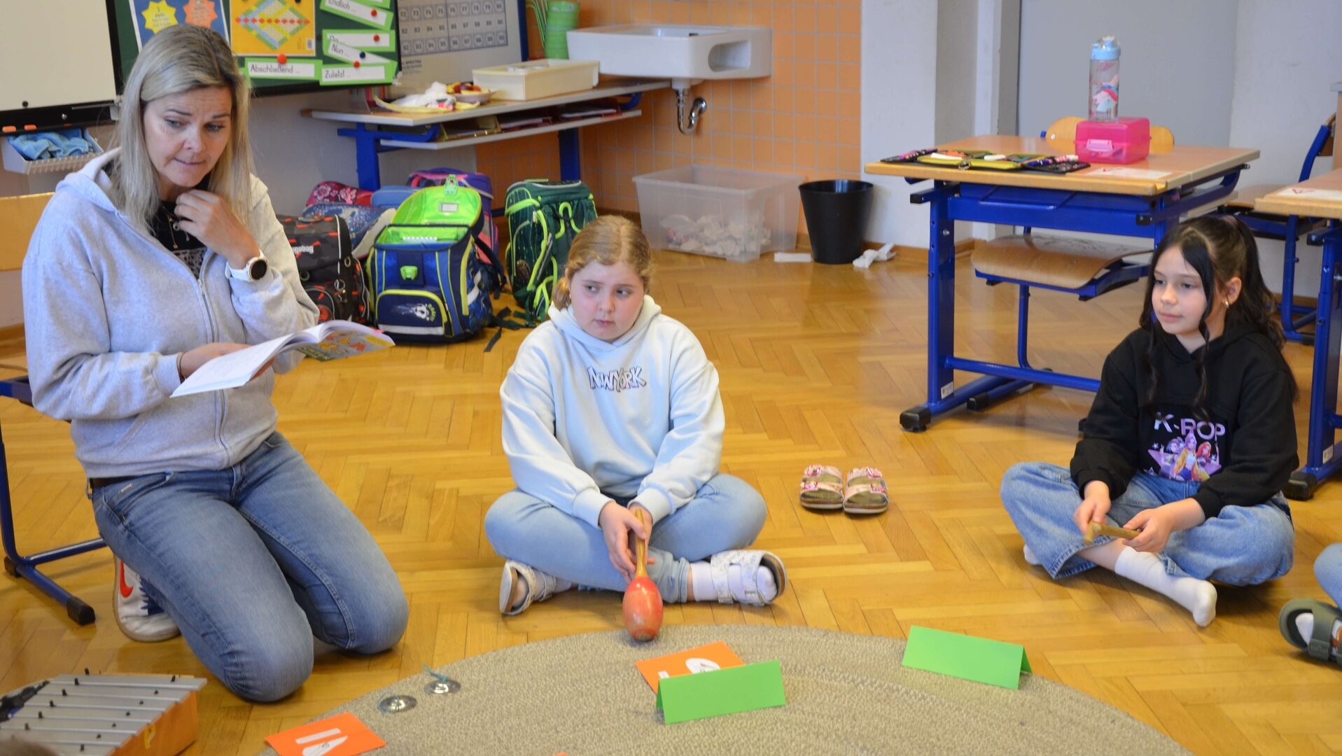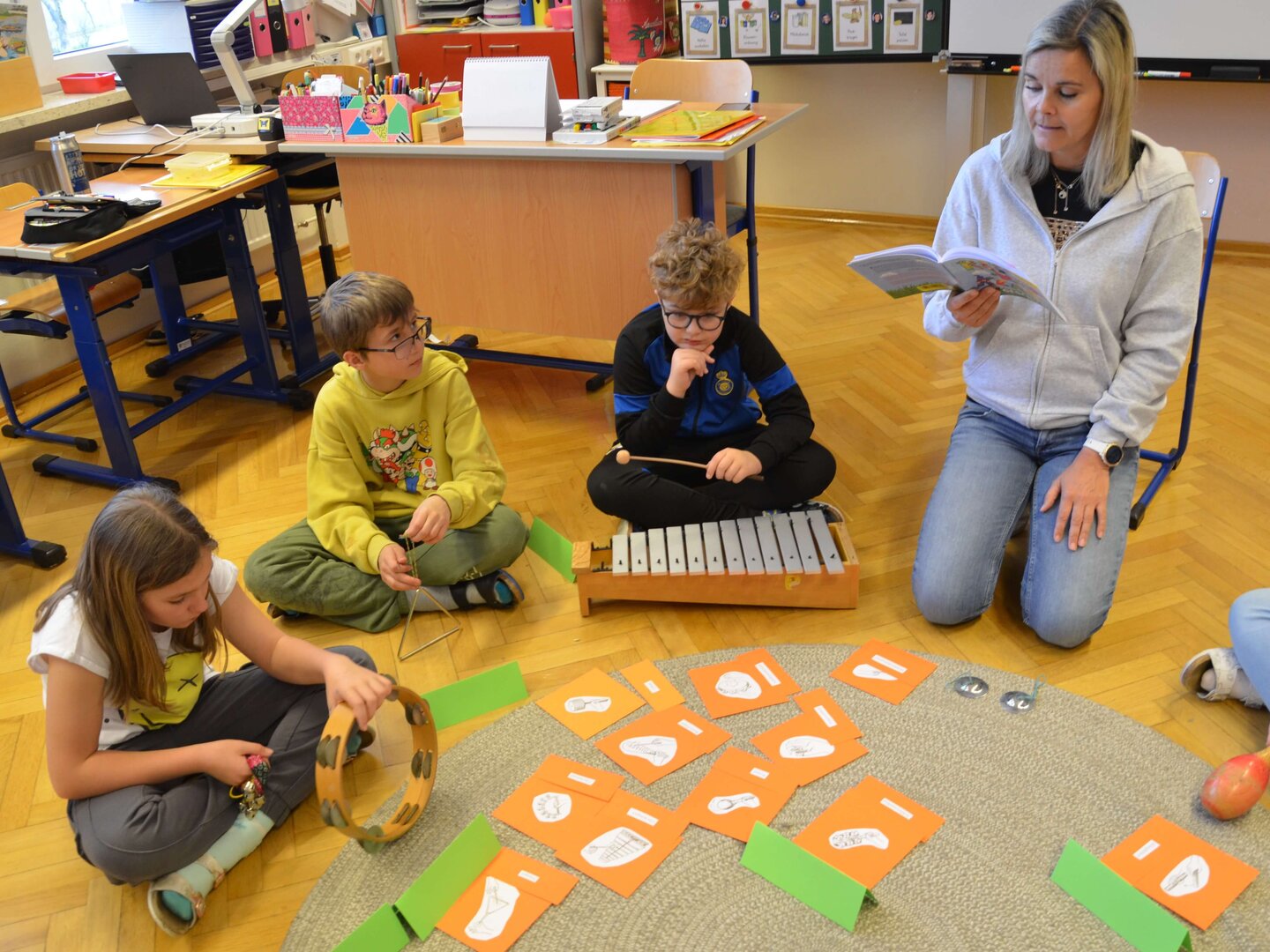 2. Vorlesestation: Bei Frau Lehrerin Angelika Kropp hörten die Kinder eine Klanggeschichte aus dem Buch “KLI KLA KLANG” und durften diese mit Musikinstrumenten untermalen.